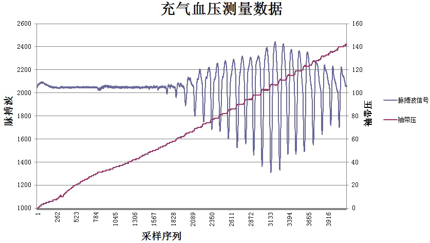 As shown in the figure below, the pulse wave and cuff pressure waveform obtained in the experimental research phase of inflation measurement.