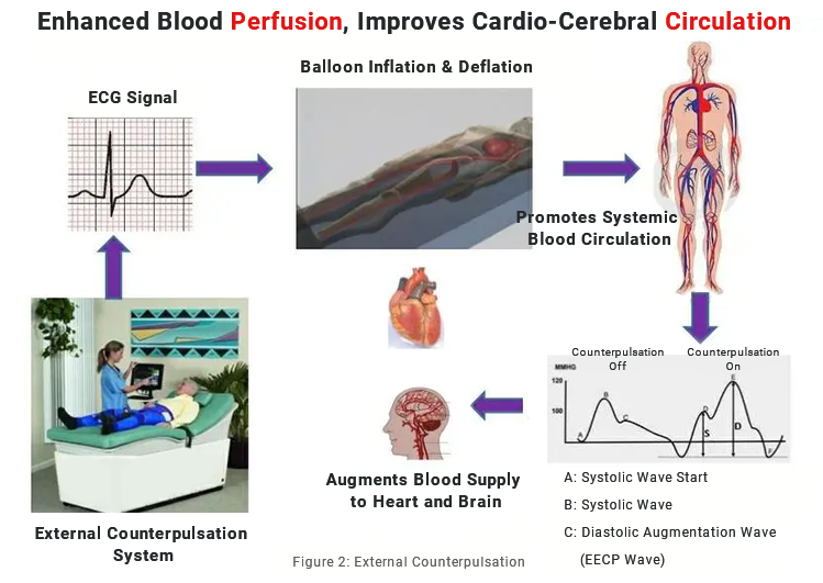 External counterpulsation is an auxiliary circulation that mechanically reduces the systolic blood pressure and increases the diastolic blood pressure in the aorta to assist the heart in doing work, improve blood circulation, and increase blood perfusion in the heart, brain, kidneys and other organs. Method: Counterpulsation increases the blood supply of the coronary arteries by increasing the diastolic pressure of the aorta, rescues the ischemic myocardium, and improves the pumping function of the heart. In counterpulsation therapy, it is crucial to fully consider the delay of the counterpulsation device in the correct time window, provide an early and accurate trigger signal, and provide feedback assessment of the degree of counterpulsation.