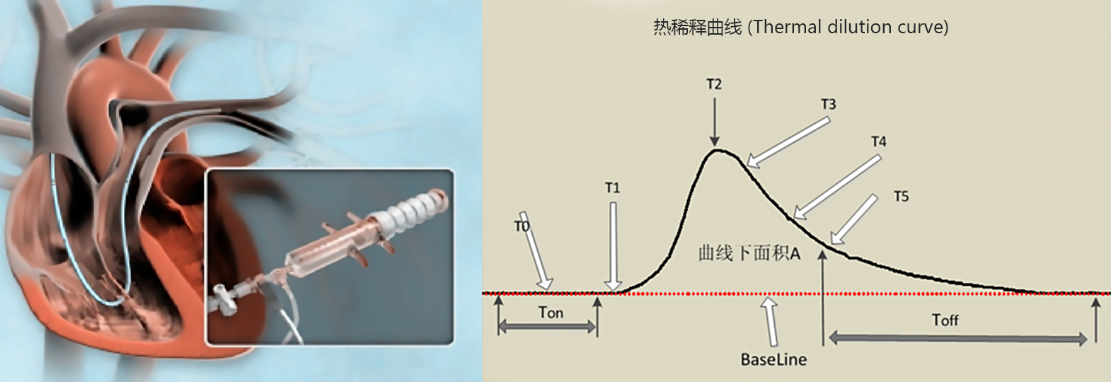 Basic principle of thermal dilution method: This system adopts the thermal dilution method, where a floating catheter is inserted into the heart from the superior vena cava, passes through the atrium and enters the pulmonary artery through the ventricle. The position of the catheter is shown in the figure. The thermal dilution method for measuring cardiac output is the instantaneous injection of a certain amount of physiological saline or glucose solution at a certain temperature into the heart (usually a solution at 0 ℃ or room temperature) at the injection end of the floating catheter. Due to the significant difference in injection temperature and blood temperature, the internal energy of the heart can change rapidly. However, under the influence of blood circulation, the blood temperature will quickly return to normal blood temperature, The high sensitivity thermistor located at the end of the floating catheter at the pulmonary artery can accurately record changes in bleeding temperature. This change in blood temperature can be described as a curve, known as the time thermal dilution curve. By analyzing this curve through relevant formulas and algorithms, cardiac output can be accurately calculated.