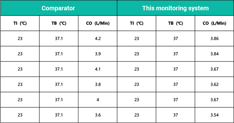 This system is validated through a large number of clinical trials to ensure the accuracy of system measurements at the frontline level. In clinical validation experiments, a well-known company's online product is used as a reference device, and the selection requirement for the reference device is to support intermittent measurement of cardiac displacement using the standard thermal dilution method. Due to the particularity of measuring cardiac displacement, the two devices cannot be fully synchronized for measurement. Therefore, using this system and reference equipment to alternately measure the test subjects, record the data, and record all the states and data of this system.