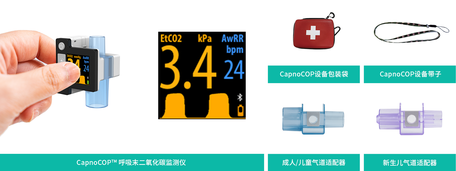 CapnoCOP™ Rapid Intervention Capnograph, compact and exquisite design and dedicated airway adapter, it is portable, plug-and-play and fast response. It may be used in the operating theater, intensive care unit, patient room, clinic, for emergency medicine and emergency transport settings. It can be used during patient transport inside and outside of the hospital environment.