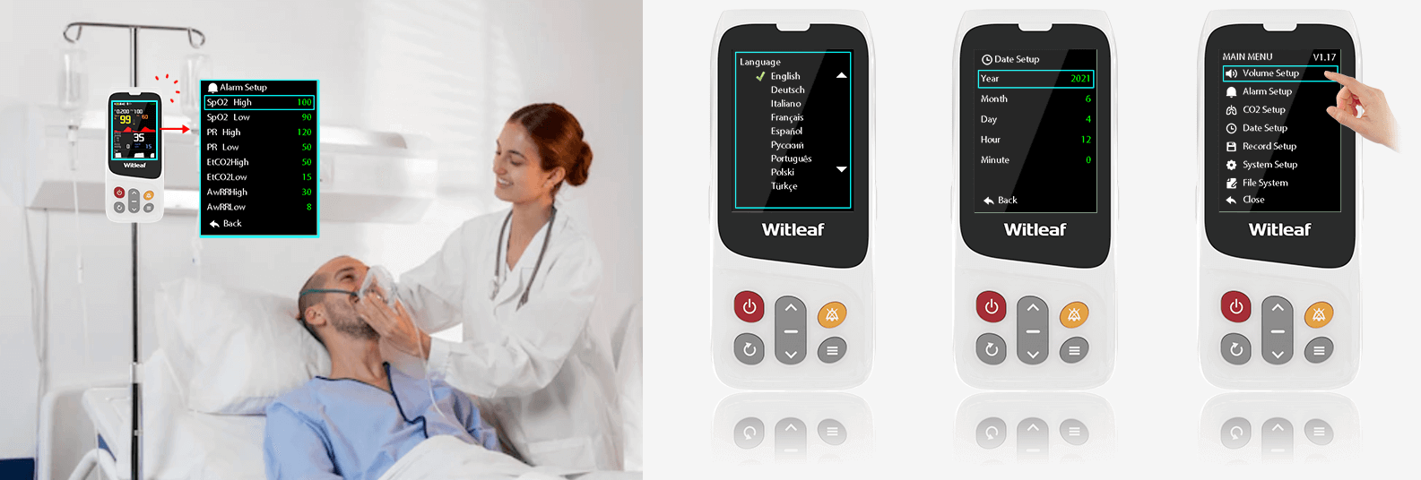 WIT-S300 Handheld Capnograph Monitor Continuous, noninvasive, real-time respiratory status monitoring of etCO2 and capnography-derived respiration rate and SpO2 and pulse rate,provides insights on respiratory status that clinicians can use to intervene early and fast if a patient begins showing signs of respiratory compromise.