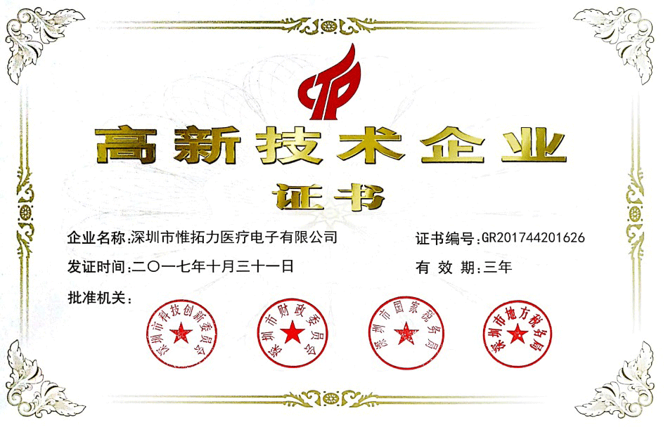 As the new year of 2018 is approaching, Shenzhen Witleaf Medical Electronics Co., Ltd. has received good news: According to the relevant provisions of the national "High-tech Enterprise Recognition Management Measures" and "High-tech Enterprise Recognition Management Guidelines", the company is recognized as It is a national high-tech enterprise and was officially awarded the "National High-tech Enterprise" certification, and the company is officially listed as a national high-tech enterprise.