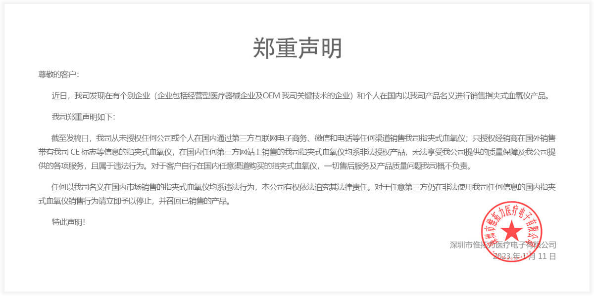关于指甲式血氧仪国内销售声明