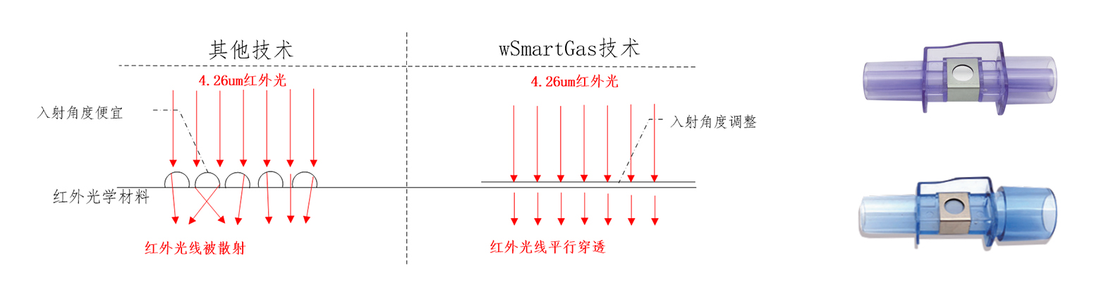 人体的呼吸气体为饱和水蒸气,在环境温度较低时,针对主流式呼吸末二氧化破测量,会在测量气室内表面冷凝形成水滴,导致穿透测量气室的红外光散射造成呼吸末二氧化碳浓度的高估,wSmartGas通过CapnoSET®主流式气道适配技术通过调整红外光线入射面的入射角度避免穿透测量气室红外光的散射保证测量的准确性;