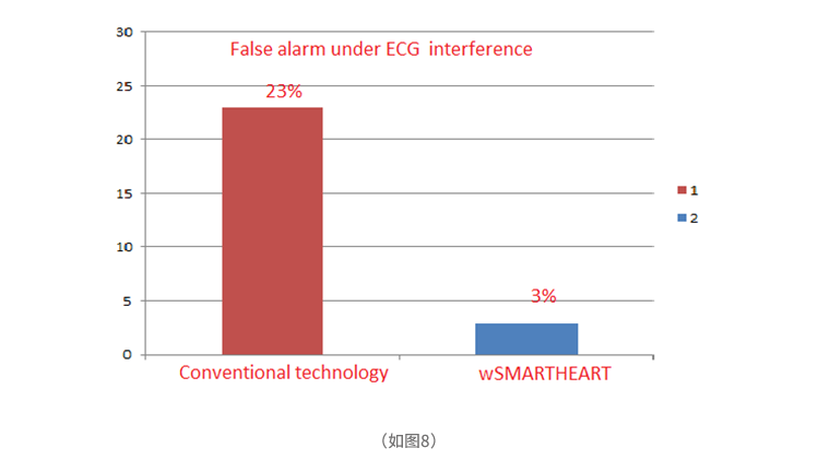 wSmartHeart®心电技术具备的抗干扰能力,能够在实际临床上更好的解决受到干扰的情況。根据临床反馈,常规技术心电错误识别带来的报警达到23%,而采用wSmartheart®心电技术错误识别带来的报警只有3%,采用wSmartheart®技术的监护仪在医院心电干扰带来错误识别误报警率能够降低20%以上(如图8所示)。