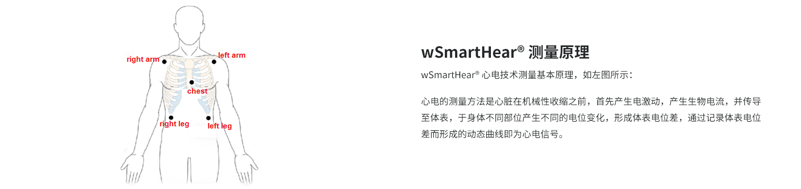 wSmartHeart®智能心电检测技术,是一种具备心电专利特征点识别的技术,融合了心电信号质量检测技术,智能切换分析导联,心电信号异常快速恢复技术,高大T波识别,干扰剔除技术,保证心率计算和心律失常分析的准确性,即使受到干扰情況,依然能够保证识别的准确性。