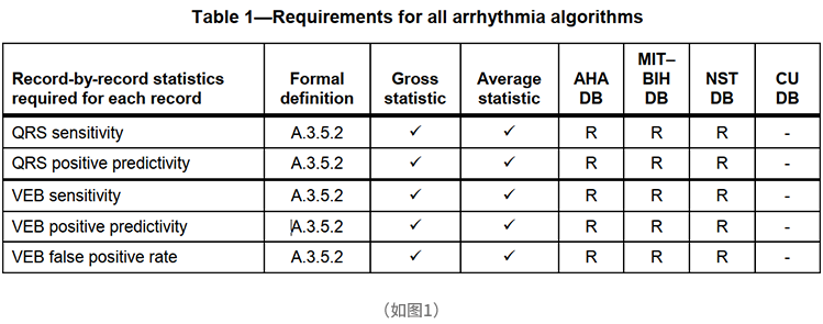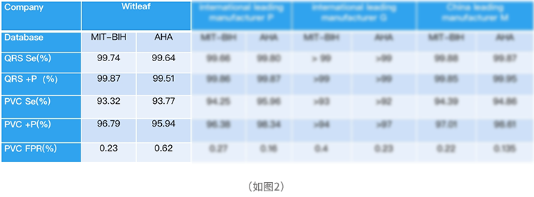 根据ANSI/AAMI EC57: 2012 Testing and reporting performance results of cardiac rhythm and ST segment measurement algorithms标准要求,这个是心电算法检测的金标准,包含了各个国际权威数据库的检测要求,心率以及心律失常算法要通过FDA认人可,必须通过EC57标准的检测。因此EC57标准检测的准确性,也是算法性能好坏的评价指标,而EC57标准主要是针对心电QRS波检测以及室性早搏的检测,主要针对的数据库是MIT,以及AHA心电数据库的检测,以下Witleaf的检测结果和一些其他一线厂商的检测结果,通过比对可以看到Witleaf的检测准确性可以达到一线水平,如图1所示。