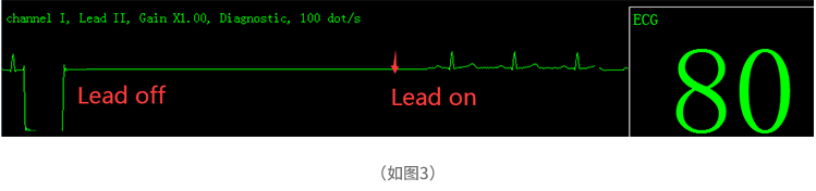 在导联过载等异常临床情况下,系统检测到信号过载或者基线漂移,立刻进行硬件放电处理,并且进行导联切换,保证过载电压不会持续加载,切换高通滤波频率,来保证系统恢复时间小于3S,结合软件滤波和硬件通道切换来保证过载信号不会对后级进行冲击,保证心电图快速恢复,稳定可靠。如图3所示,导联脱落下,在接上导联快速恢复的示意图。