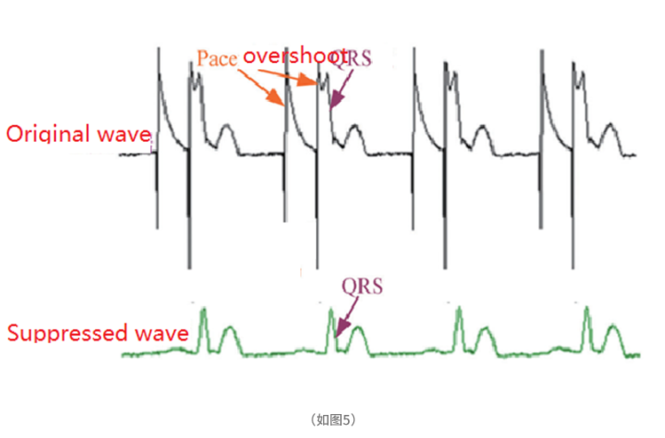 一些佩戴起搏器病人会产生大的PACE过冲信号,具备硬件PACE脉冲抑制功能,如下图所示PACE脉冲存在很大的过冲,其幅度达到QRS波幅度,严重影响心率计算的可靠性,利用硬件PACE脉冲滤波,能够有效的去除PACE脉冲信号,使抑制后的心电波形是正常的QRS波波形,能够进行有效的识别,而没有PACE抑制功能的心电波形会导致误识别,产生误报警(如图5所示)。