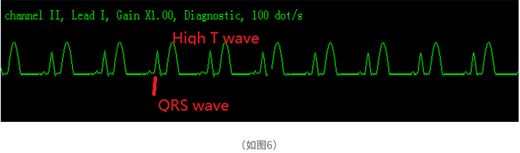 高大T波对于心律失常病人是常见的类型,wSmartHeart®心电技术具备良好的高大T波抑制能力。如下图所示T波幅度已经大于R波幅度,wSmartheart®心电技术能够通过RR不应期以及T波形态识别算法能够滤除高大T波,有效保证临床上心率计算的可靠性(如图6所示)。