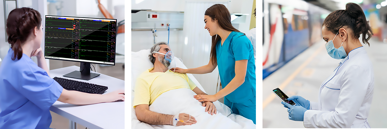 XH-30 掌式生命体征监护仪,在多病人模式下支持与其他系统的互联互通,可以将已保存的数据通过 RJ45 网络接口以及 WIFI 将存储数据采用 HL7 协议传输至医院信息系统平台,可以通过 RS232 接口,蓝牙通信功能采用自有协议传输数据,可以轻易连接 PC 软件或者移动端应用。在单病人监护模式下,可以与惟拓力医疗中央监护系统互联,实现中央监护系统功能。